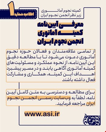 - از تمامی علاقهمندان و فعالان حوزه نجوم آماتوری دعوت میشود تا با مطالعه دقیق این آییننامه، از نحوه عملکرد و مسئولیتهای کمیته آماتوری آگاهی یابند و در مسیر پیشبرد اهداف این کمیته، همکاری و مشارکت فعال داشته باشند.