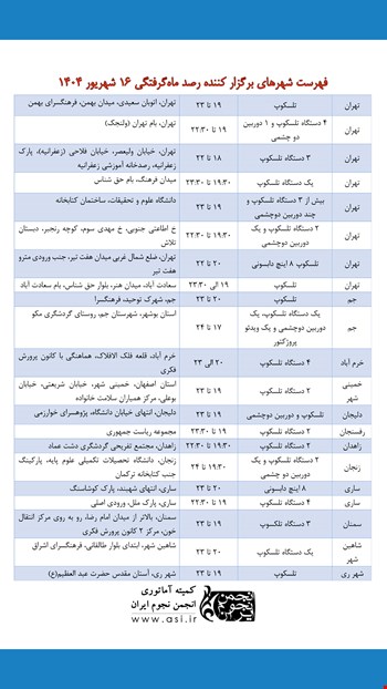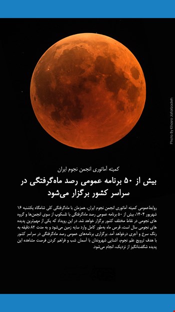 به گزارش روابط‌عمومی کمیته آماتوری انجمن نجوم ایران، همزمان با ماه‌گرفتگی کلی شامگاه یکشنبه ۱۶ شهریور ۱۴۰۴، بیش از ۵۰    برنامه عمومی رصد ماه‌گرفتگی با تلسکوپ از سوی انجمن‌ها و گروه‌های نجومی در نقاط مختلف کشور برگزار خواهد شد.