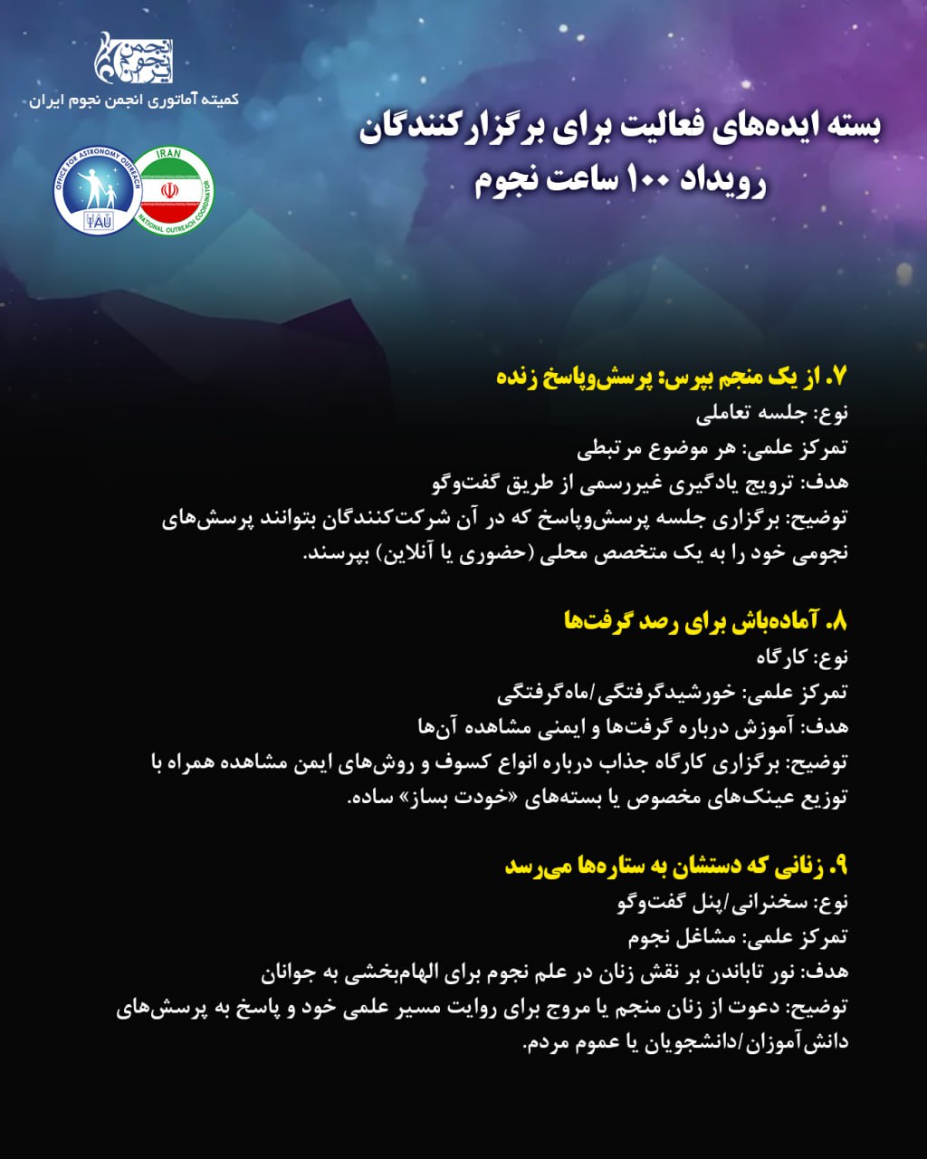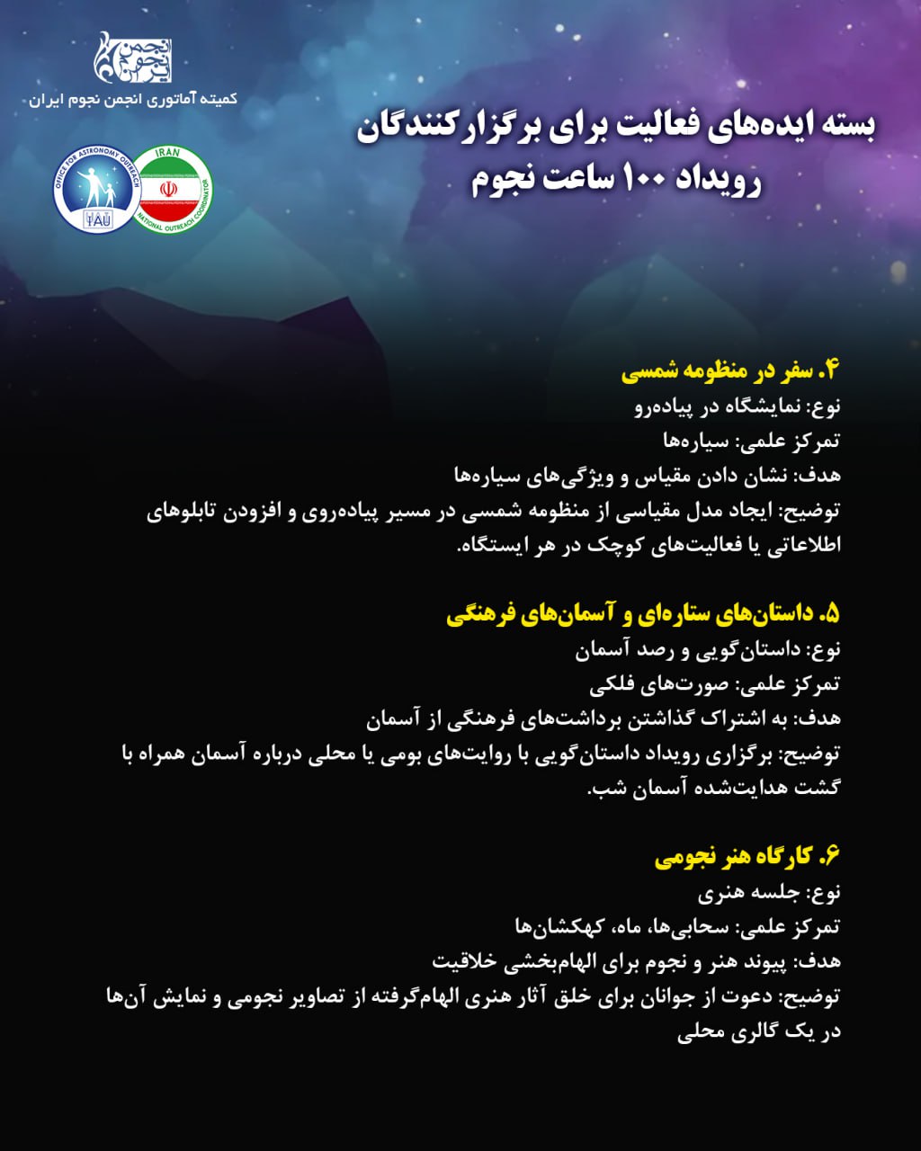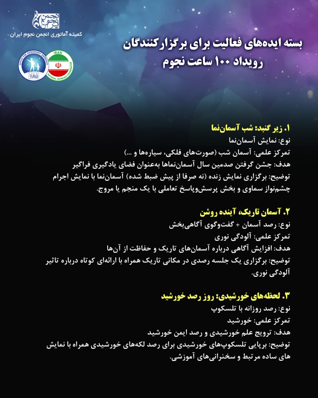 همچنین به برگزارکنندگان پیشنهاد میشود با بهرهگیری از بسته ایدههای فعالیت، برنامههایی متنوع همچون رصد عمومی، کارگاههای آموزشی، مرور قصههای آسمان شب، و نشستهای پرسش و پاسخ با منجمان را تدارک ببینند.