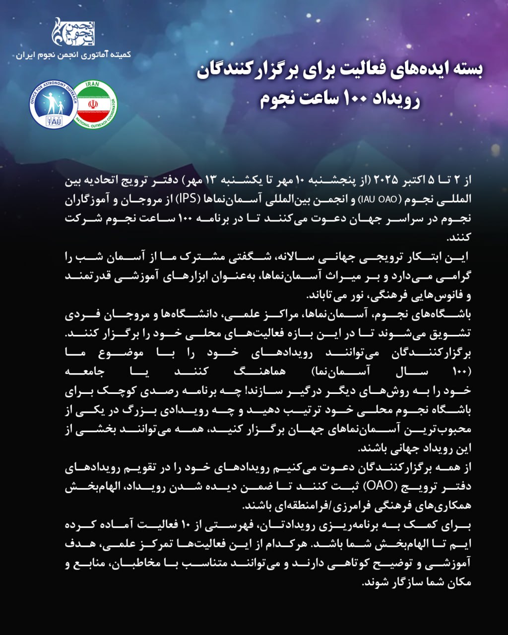 جشن جهانی «۱۰۰ ساعت نجوم» از ۱۰ تا ۱۳ مهر ۱۴۰۴ (۲ تا ۵ اکتبر) همزمان با سراسر جهان در ایران نیز برگزار میشود. این برنامه با همکاری مشترک کمیته آماتوری انجمن نجوم ایران و دفتر ترویج اتحادیه بینالمللی نجوم در ایران اجرا خواهد شد.