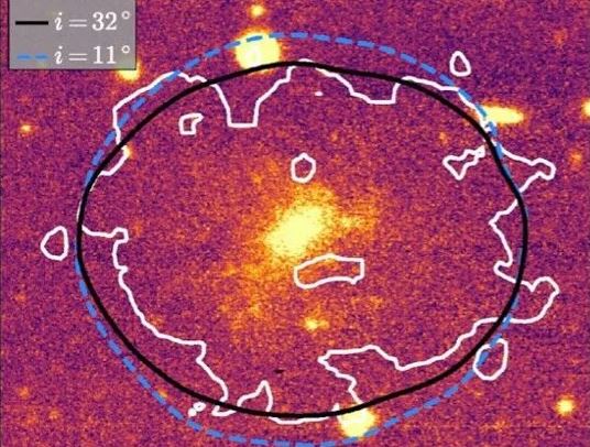 بسیار پایین است و به نظر می رسد فاقد ماده تاریک است. این سرعت بسیار پایین با پیش بینی هر دو نظریه ی ماده تاریک و موند ناسازگار است. در پژوهشی که اخیرا انجام شده است نشان داده شده است که این سرعت پایین صرفا یک اثر ظاهری است. در واقع سرعت پایین گزارش شده بر مبنای زاویه تمایل تخمینی حاصل از بیضویت ظاهری کهکشان است. در پژوهش اخیر با شبیه سازی تحول دینامیکی این کهکشان نشان داده شده است که بیضوی شدن توزیع ماده نتیجه ای از دینامیک موندی است که منجر به تداعی نوعی زاویه تمایل ظاهری میشود. بنابراین در این چارچوب سرعت پایین کهکشان صرفا یک اثر ظاهری است. در واقع اگر نظریه موند معتبر باشد در اینصورت زاویه تمایل این کهکشان کمتر از مقدار رصد شده است و زاویه تمایل ظاهری در واقع ناشی از توزیع بیضوی ماده در چارچوب دینامیک موندی است.
